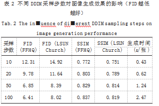 在扩散模型的图像生成过程中,传统DDPM依赖1000步以上的马尔可夫链采样实现高质量图像重建,导致生成过程耗时严重,难以满足实际应用的实时性需求。为提升采样效率,引入DDIM(Denoising Di■usion Implicit Models)降采样路径,借助非马尔可夫性构造推理路径,实现跳步采样的无偏还原能力[4]。在本研究中,基于DDIM构建可调步长采样系统,设置采样步数为10、20、50和100,并在FFHQ与LSUN Church等数据集上测试不同步数下生成质量,结果如表2所示。