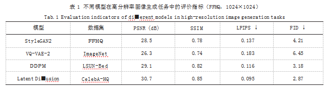 高保真图像生成要求模型不仅能复原目标图像的结构特征,还需在纹理、边缘和语义一致性方面达到真实图像水平。为全面评估生成图像的保真度与多样性,常用指标包括峰值信噪比(PSNR)、结构相似性指数(SSIM)、感知图像质量评估指标(LPIPS)以及分布相似度评价如Fréchet Inception Distance(FID)。在实际评估中,FID越低代表生成分布越接近真实图像分布,SSIM与PSNR值越高表示图像结构还原效果越好。在公开数据集FFHQ上,几种主流扩散模型在1024×1024分辨率下的对比结果如表1所示。