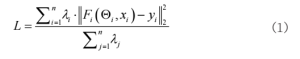在高保真图像生成任务中,引入多尺度UNet结构融合策略,并行构建不同分辨率下的多分支网络,使模型在采样过程中能够同时捕捉局部细节与全局语义信息,从而增强对高维图像特征的表达能力[2]。实验在原始512×512分辨率基础上,加入256×256与128×128两个下采样尺度,并在各尺度间引入可学习的跳跃连接,提升特征对齐精度。融合策略的损失函数L定义如式(1)所示: