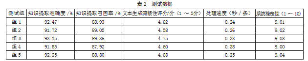 个数据集包含500 000条数据记录。每条数据包含的内容涉及建筑项目中的多个层面,包括项目编号、文档类型、文档内容摘要、项目技术指标、图纸或图像文件、技术报告内容、设计参数以及施工日志等。在本次实验中,整个测试过程执行了5轮,在每一轮测试中,数据被随机分为5组,每组包含100 000条数据。这些组是根据数据的内容进行划分的,测试的主要指标包括知识提取准确度(Precision)、知识提取召回率(Recall)、文本生成的流畅性评分(Fluency Score)、处理速度(Processing Speed)以及系统稳定性(System Stability)。其中,知识提取准确度表示从文本中正确提取出关键信息的比例,召回率则反映了系统从给定数据集中提取所有应有信息的能力。文本生成的流畅性评分基于人工评估,对生成文本的语言表达和逻辑性进行打分。处理速度可用来衡量系统处理每条数据所需的时间,而系统稳定性则可用来评估系统在长时间高负荷运行下的表现。测试数据具体如表2所示。