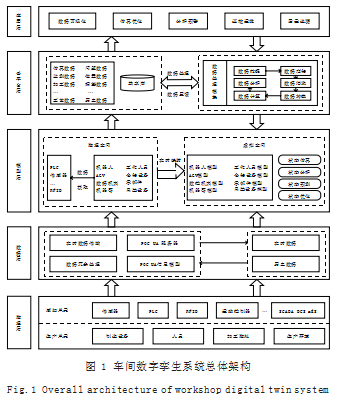运用数字孪生技术,可以实现生产流程数字化和仿真分析可视化,协助企业对生产效能和产品质量做出精准的把控。基于实际需求与工程实践,数字孪生车间的总体架构如图1所示。