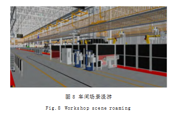 车间场景漫游效果如图8所示。场景漫游功能中,虚拟车间与现场车间设备运行状况保持动态一致,用户以不同视角,通过移动、缩放和旋转等操作实现车间的在线巡检,了解各台设备的运行情况。