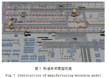 基于SolidWorks、3DsMax和Unity3D等软件协同,快速构建车间设备模型,之后对三维实体模型进行贴图、光照等渲染[8]。渲染出来的建模以.FBX格式导入Unity3D中,在Unity 3D中为模型添加动作逻辑模型,确保虚拟模型与实际生产车间设备在行为和逻辑保持一致,达到虚实交互的效果,制造车间模型构建如图7所示。