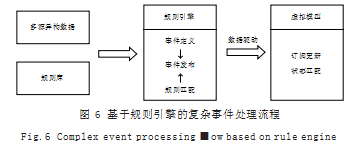 基于事件处理流程如图6所示,将来自车间的多源异构特征数据以及模式规则库输入规则引擎,即可输出复杂的事件消息发布。CEP系统(复杂的事件处理系统)实时监控多个数据流,并在数据流中测定出匹配预先定义规则库的标定事件或行为时,自动触发相关事件的处理机制,如触发预警行为以及调用外部应用服务等。数据经规则匹配转化为指定事件驱动虚拟模型,通过主题订阅实现模型状态匹配和更新。
