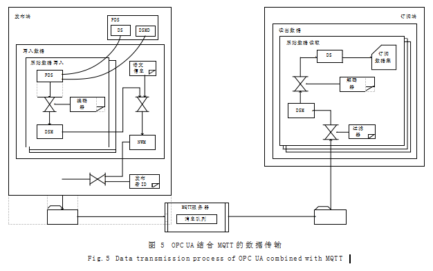 数据发布/订阅过程中数据的传输如图5所示。发布数据端将来自OPC UA的数据汇集成多组有序数据集,各组中均具有一个由两部分组成的PDS,分别是数据集(DS)和数据集语义消息定义(DSMD)。各PDS经由编码器进行编码,同时加入报头标识再形成DSM。各DSM并入能反映出该组数据来源等的语义信息,进一步合并为NWM,继续添加发布者标识以及指定订阅主题等写入多组数据,按照指定的服务质量(QoS)级别,以数据包持续分发出去。MQTT Broker服务器采用消息队列的机制,接收发送的消息报文,并根据订阅者订阅的主题将报文转发给订阅者。OPC UA客户端通过订阅请求的方式与OPC UA服务器建立连接。另一视角,订阅者指定了订阅主题会接收到消息报文,这些报文分别通过滤波器、解码器等逆向解析,依次得到DSM、PDS和原始发送的数据,再将数据归约得到原始多组数据集,将其同步至中台中心库。