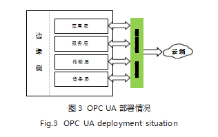 边缘层有效集成先进的通信技术与计算能力,实现了对现场数据的实时收集、处理与初步分析。该层利用协议转换技术,将不同设备与系统的数据进行标准化,并借助边缘计算设施完成实时处理,有效减少了数据传输延迟,并提高了系统的响应速度。与此同时,边缘层还负责将非实时且长周期的业务决策数据上传到云端进行处理。在此过程中,边缘层综合运用强实时有线网络与高覆盖无线网络传输数据,这为云计算平台提供了数据支持。值得一提的是,为更好地适应新网络架构需求,边缘层还解耦与重构了智能网关、独立式控制与嵌入式控制等设备[3]。OPC UA部署情况如图3所示。