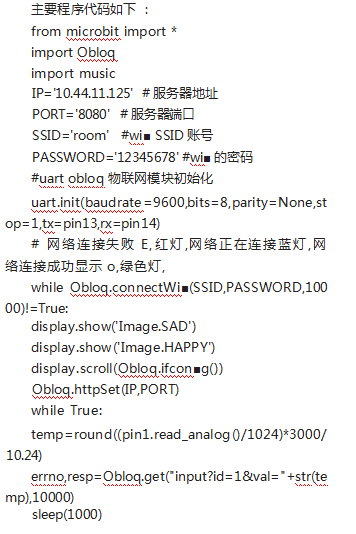数据传输至服务器是通过物联网(IoT)模块接入无线网络实现的。该IoT模块配备有四个引脚,分别为TX(发送)、RX(接收)、-(接地)和+(电源)。首先,需要将IoT模块与micro:bit进行物理连接,并在程序代码中进行相应的配置。例如,通过uart.init(baudrate=9600,bits=8,parity=None,stop=1,tx=pin13,rx=pin14)设置串口通信参数,以确保数据传输的稳定性和准确性。