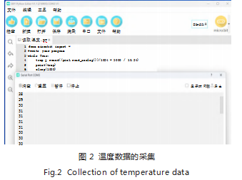 传感器作为关键的数据采集设备,能够获取包括温度、湿度、光照强度和二氧化碳浓度在内的多项空气指标。普通计算机通常不具备直接连接传感器的接口,因此,需要使用具备相应接口的智能终端来完成数据采集任务。本研究选用micro:bit作为智能终端,以实现数据的获取。以温度数据采集为例,将温度传感器连接至micro:bit,然后利用BXY软件进行编程,设置系统每隔一秒钟自动采集一次温度数据,并通过串口输出以实现数据的实时监测和传输。这一过程的具体实现方式如图2所示。在实际数据采集中,需要注意采集优化,根据实际需求,合理设置数据采集频率和传感器布置位置,避免不必要的数据采集[2]。
