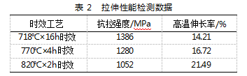 对在不同温度下,采用最佳时效时间处理后的试样进行拉伸性能试验,得到的检测结果如表2所示,标准要求是试样抗拉强度≥1275MPa。综合来看,718℃×16h时效的综合强化效果最好,能达到抗拉强度标准,且高温伸长率也能达到锻造标准。同时,820℃×2h时效工艺的高温伸长率最大,塑性效果较为突出。结合XRD进行定量分析,δ相(Ni3Nb)含量会因时效温度升高而逐渐增多,这种变化规律会直接影响合金的拉伸性能。δ相析出会消耗Nb等强化元素,导致γ"相体积分数减少,同时δ相本身强化能力弱于γ"相;δ相在晶界处呈短棒状分布,与晶界形成一定角度,可协调晶界与晶内强度差异,并通过钉扎作用延缓裂纹扩展,从而提高塑性。