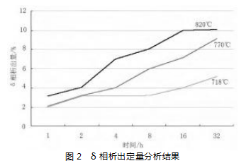 在718℃、770℃、820℃三种不同温度下进行时效处理,对δ相析出做定量分析,得到的数据如图2所示,在1h初始阶段,718℃、770℃下的析出量均在2%左右,820℃下的析出量约为3.2%;到32h时,三种温度下的析出量差距逐渐增大,温度由高至低对应的析出量分别为10.1%、8.8%、5.2%。总的来看,发现γ基体相、δ相(Ni3Nb)及NbC碳化物的衍射峰较为清晰,但没有检测到强化相γ'(Ni3(Al,Ti))与γ"(Ni3Nb)的独立衍射峰。原因在于γ'相含量较低,其体积分数不能满足XRD检测下限,且γ"相峰位γ基体相峰位重叠,无法分离识别。当时效时间相同时,δ相析出量与温度变化成正比关系,也就是说820℃下的δ相析出量相对较多,718℃下的则较少。主要是因为δ相的析出动力学与温度存在关联,温度越接近最佳析出温度,原子的扩散速率越快,使得δ相形核与生长驱动力增强,进而提高了其体积分数[5]。