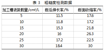 用不同装载量的加工槽液处理试件,通过检测确认试件的拉伸性能变化情况,标准要求是断后伸长率≥12%,断面收缩率≥15%,检测数据如表3所示。总的来看,GH4169高温合金的断后伸长率随加工槽液装载量的增加也逐渐提高,当装载量未超出15cm2/L时,合金的断后伸长率不能达到技术标准。同时,合金的断面收缩率均≥15%。