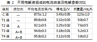 通过对五组不同配制的电解液进行电解性能测试实验,研究获得了各组电解液在电流效率、槽电压及析氢量等关键指标上的差异数据,结果如表2所示。