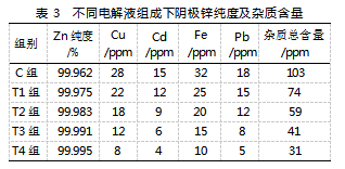 通过分析各组电解液电解得到的阴极锌片,研究获得了不同电解液组成下阴极锌纯度及杂质含量的量化数据,试验结果如表3所示。