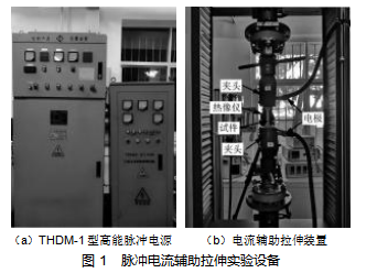 为研究脉冲电流对7075-T651铝合金拉伸力学性能的影响,本研究选用1mm厚7075-T651铝合金薄板进行脉冲电流辅助拉伸试验,拉伸试件宽度为12.5mm,标距为50mm。电辅助拉伸所用电源为THDM-1型高能电脉冲电源系统和脉冲参数测试系统,如图1(a)所示。拉伸试验基于万能试验机进行,夹头通过绝缘转接头安装在拉伸机上,保证了电拉伸过程中夹头与拉伸试验机之间的绝缘,如图1(b)所示。