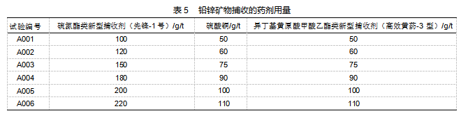 如表5所示,在设定药剂用量时,硫酸铜和异丁基黄原酸甲酸乙酯类新型捕收剂(高效黄药-3型)为两种共同作用于锌矿物的药剂,其用量需保持在1:1。两者用量之和需与硫氮酯类新型捕收剂(先锋-1号)保持1:1的比例。由此,确保其浮选效果。