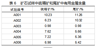在多种测试条件下,测试矿石试样中硫精矿中有用金属含量,以及尾矿中有用金属含量。其具体结果如表6所示。