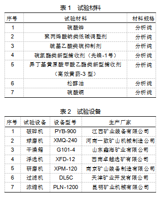 在对多金属矿选矿工艺优化时,需选择多种试验材料,具体如表1所示。除表1中的材料外,试验中还需应用捕捉剂Z-200、LP-11等,用于提高铅锌的回收率。