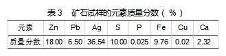 本次试验过程中的矿石试样为露天矿山,该矿山内存在多种金属矿物[2],如闪锌矿、方铅矿等,原矿中铅(Pb)品位为6.5%,锌品位(Zn)达18%,硫(S)品位约为10%。该矿石的化学性质,如表3所示。在该矿石中,品位较高的元素分别为Zn、Pb、S等,其余元素均未达到回收标准。将该矿石试样作为试验对象,展开试验测试。