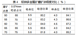 在试验操作过程中,依照设定的条件对矿石进行磨矿处理,随后开展浮选试验,并精准记录铅、锌的品位和回收率等重要指标,铅锌多金属矿磨矿浓细度对比试验结果,如表4所示。