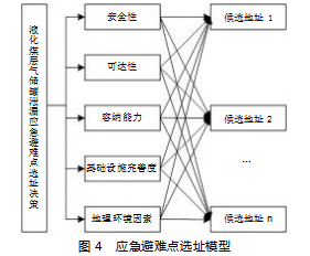 如图4所示,本文在进行液化煤层气储罐泄漏应急避难点的选址决策时,设置了安全性、可达性、容纳能力、基础设施完善度和地理环境因素这五个主要标准,并在每个标准指标下,设定了液化煤层气储罐泄漏应急避难点的选址子指标,见表2。