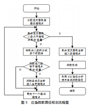 确定了液化煤层气储罐泄漏时最佳的应急避难点后,即可进行应急疏散路径规划。这里本文采用分组疏散策略[5],就是将受灾居民点按照一定规则拆分成多个疏散组,并分别引导至不同的避难点,以此解决液化煤层气储罐泄漏扩散快且范围大的问题。那么,本文设计的液化煤层气储罐泄漏扩散应急疏散路径规划具体流程如图5所示。