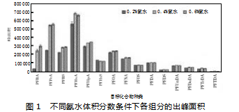 实验中流动相采用的是MeOH-NH3,为了提升各组分的洗脱效果,配制了3种氨水体积分数不同的MeOH-NH3溶液,分别为0.2%、0.4%与0.6%,在其他条件不变的情况下,对样品溶液进行检测,由此得到不同体积分数氨水条件下各种组分的出峰面积,如图1所示。由图1可知,氨水质量分数的不同,各组分出峰面积并不相同,PFBA、PFPeA、PFBS、PFHpA、PFOA、PFNA、PFDA7种组分当中,随着氨水质量分数的增加,各组分出峰面积呈逐渐提高的趋势;在PFHxA、PFOS、PFDS、PFUnDA、PFDoDA、PFTrDA、PFT-DA7种组分当中,随着氨水质量分数的增加,各组分出峰面呈先提高再下降的趋势;随着氨水质量分数的增加,PFHxS呈逐渐下降的趋势。另外,若氨水体积分数处于低水平状态,PFBA与PFPeA出现了明显的拖尾问题。综合表明,当氨水体积分数为0.4%时,样品溶液综合洗脱效果最好。