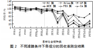 水样过滤是全氟化合物测定过程中的重要环节,这一环节进行的好坏,直接关系到最终测定结果的准确性。为了提升测定结果准确性,分别选择6种常见滤膜作为实验对象,分别为再生纤维素(RC)膜、尼龙(Nylon)膜、玻璃纤维(GF)膜、混合纤维素(MCE)膜、聚醚砜(PES)膜、醋酸纤维(CA)膜。通过对6种滤膜的实验分析,可以得到如图2所示结果。由图2可知,对于大部分组分来说,采用GF膜时的回收率最大,且其他组分通过GF膜过滤后的回收率也处于较高的水平,仅略低于PES膜,而Nylon膜与MCE膜过滤后各组分回收率均处于较低水平。综合表明,选择GF膜为最佳。
