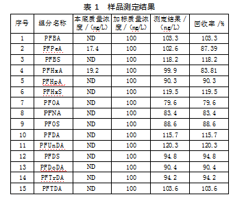 按照上述方法对某地区水样进行测定后,可以得到如表1所示结果。以后表1可知,在所检测的水样当中,15种氟化物组分均被检测,回收率在79.6%~120.3%范围内,其中,PFOA的检出率最低,而PFUn-DA的检出率最高。