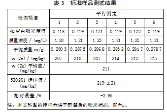 通过对环境标准样品(水系沉积物中重金属总量/520201)取6次平行样,按照标准样品试液的制备进行前处理后,测定w(Zn),结果如表3所示。