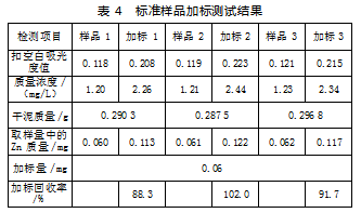 从表4数据可知,3个加标样品中Zn含量的加标回收率分别为88.3%、102%和91.7%,满足一般国标方法加标回收率在80%~120%之间的要求。因此,符合标准方法要求。
