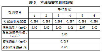 基于有证标准物质的测定,采用校准曲线中间点(理论质量浓度为3.00 mg/L)按全程序测定方法对样品平行测定6次,计算结果如表5所示。
