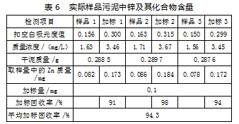 本文选用了污水处理厂进水沉降后的污泥共6份(该6份污泥采样点均为同一处且尽可能的混合均匀),其中,有3份加入了1 mL的质量浓度为100.0 mg/L的锌标准使用液。测定污泥中的锌及锌化合物的含量,结果如表6所示。