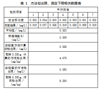按照<<环境监测分析方法标准制订技术导则>>规定,本次实验的方法检出限测试数据是通过对空白试样进行7次试验,将测定结果换算为样品中的浓度后,计算标准偏差,如表1所示。