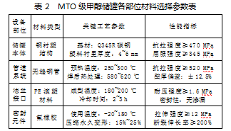 在MTO级甲醇储罐材料选择与优化过程中,如表2所示,通过严格控制各部位材料的工艺参数以及性能指标,确保设备整体的耐腐蚀性能以及机械强度满足使用要求,其中储罐本体采用的钢衬塑结构,基材选用Q345R碳钢,具有较高的强度以及良好的焊接性能;无缝钢管的焊接工艺参数严格控制在规定范围内[4],保证焊缝质量;橡胶砖板衬里的硫化工艺参数直接影响其与基材的结合强度,必须严格执行工艺要求。