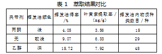 由表1可知,在不同夹带剂情况下,挥发油的颜色和黏稠度呈现明显的区别。使用丙酮为夹带剂情况下的颜色最浅,挥发油黏度最小、挥发油中物质的种类最少。使用乙醇做夹带剂的情况下,颜色最深,挥发油黏度最大、挥发油中物质的种类最多。