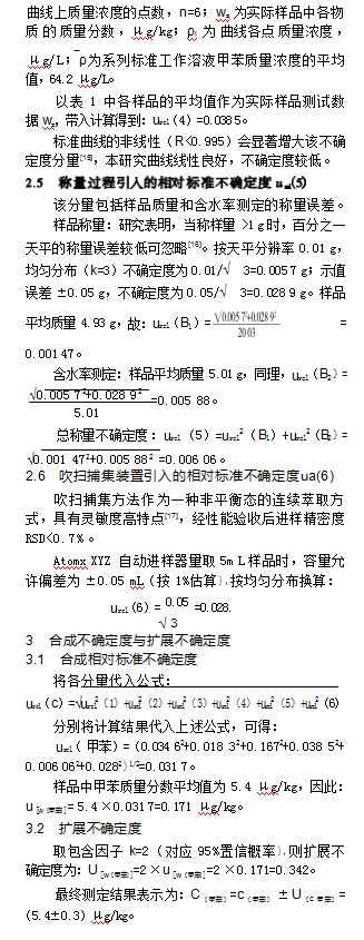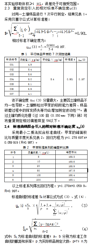 摘要:采用吹扫捕集/气相色谱质谱法(P&T-GC/MS)对土壤中甲苯的测定过程进行了不确定度评定。通过建立数学模型识别关键影响因素,系统量化了标准溶液配制、微量注射器使用、样品重复测定、标准曲线拟合、称量过程及吹扫捕集装置操作等6类不确定度分量。