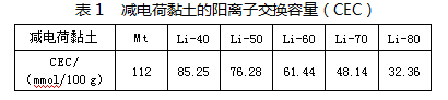 表1为减电荷蒙脱土的阳离子交换容量(CEC),由数据可知,随着锂离子不断增大,蒙脱土的阳离子容量随之降低,阳离子交换容量(CEC)在加热后的降低代表层电荷的减少[15]。