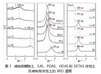 图3-2为系列季铵盐改性蒙脱土XRD谱图。与原土XRD相比,单双多季铵盐改性蒙脱土的d(001)均向小角度方向偏移,根据Bragg方程:EAS改性土的层间距为1.39 nm,PDAS改性土的层间距为1.380nm,HDAS和DETAS改性土层间距均为1.386nm。d(001))减去单个硅酸盐片层(TOT层)的厚度0.96 nm,计算出蒙脱土层间有机相高度为0.42 nm±0.01 nm,这与烷基季铵盐亲水头最小截面相一致,表明季铵盐在层间以其最小截面垂直于蒙脱土单元层的方式排列。由图3-3可知,随锂数量的增加,峰的强度逐渐减弱,说明蒙脱土的电荷在逐渐降低,CEC随之降低,可交换阳离子的量减少。交换后形成的晶体结构较少,衍射峰强度减弱。原土改性后的层间距最大,它含有的电荷数最多,从而能进入更多的改性剂分子。减电荷土经过PDAS改性后,层间距由0.969 nm增加到1.36 nm±0.01 nm,同样说明PDAS以单层排列进入层间,结合红外谱图2说明单双多系列季铵盐进入层间。