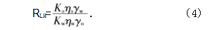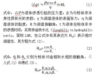 式中:Ko和Kw分别为粉体对油和水的润湿性系数;ηo和ηw分别油相和水相的黏度;γo和γw分别为油相和水相的表面张力;βo和βw分别为测油相和水相时粉体床性质参数。对于同种粉体在相同的Washburn管中并且填充状态一致时,βo和βw应该较为接近。因此方程可变形为式(4):