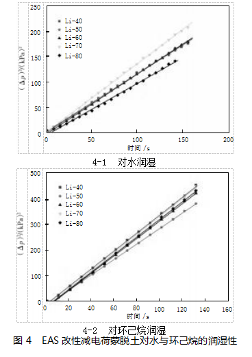 利用Washburn压力法作润湿性研究,以(Δp)2对时间t作图,如图4所示,这里仅示出EAS改性土的水润湿和环己烷润湿,其他类似。所拟合各润湿性速率直线的最小二乘法回归系数均大于0.99,表明实验结果可靠,此方法适合测定有机改性减电荷蒙脱土。改性土ko和kw值及亲油亲水比LHR结果如表2所示。结合表2可知:经系列季铵盐的改性,Li-40、Li-50、Li-60蒙脱土亲油特性迅速变为弱亲油特性,而对于层电荷较小的Li-70和Li-80,LHR值有所增加,说明它们变得更加具有亲油特性,由此说明,对于层间电荷较小的黏土矿物来说,改性后对油的润湿性更好,不利于油田中残余油的排出。