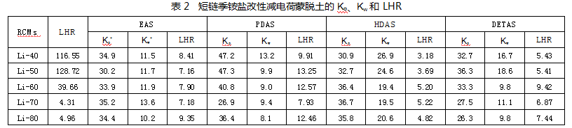 由LHR整体结果而看,对于RCM改性土而言,PDAS>EAS>DETAS>HDAS,表明亲油性依次减小。从它们的结构看,相对于EAS而言,PDAS有长的碳链,进入层间后亲油性更强,DETAS带有3个亲水基团,其亲油性较差,HDAS具有较长的碳链,少量分子进入层间,因而其润湿性最差。从表2中也可以看出,EAS改性土,随着层电荷的减小,LHR值变化不大,可能是因为其分子结构小,能够很好地吸附在黏土层间,因而润湿性变化不大。从数据看出,PDAS、HDAS、DETAS改性土随着层电荷的减小,其润湿性值LHR有较大变化,且是增大的,说明了层电荷的减少对三者的吸附有着很大的影响。季铵盐的类型和黏土层间的电荷决定有机阳离子在层间的分布,进而影响RCM改性土的润湿性[17-18]。总体来讲,对于改性土润湿性而言,具有合适的链长和电荷对改性至关重要。