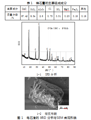 电石渣在宏观上为灰白色固体粉末,通过XRF测定其化学成分,结果如表1所示。为研究电石渣中的矿物组成,对其进行了物相分析,结果如图1-1所示。可以看出,其主要组成为CaO和SiO2,分别占87.42%和8.34%。图1-2为电石渣的微观形貌,为不规则的块状结构,粒度在30μm左右。
