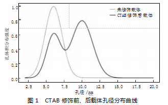 经CTAB调控处理后,载体孔道结构重构显著。气体吸附法(BET法)测试显示,介孔(2~10 nm)体积分数由45%升至72%,平均孔径从6.1 nm增至9.0 nm,孔容由0.42 cm3/g增至0.61 cm3/g,比表面积稳定在280~290 m2/g。孔径分布呈双峰形态,形成梯度孔道结构,有利于反应物多级扩散,如图1所示。