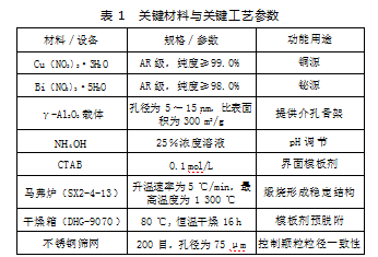 催化剂采用Cu(NO3)2·3H2O和Bi(NO3)3·5H2O(物质的量比为3∶1)为前驱体,在pH值为9.5条件下,共沉淀反应4 h,并老化12 h。所得沉淀与CTAB混合超声30 min,负载至γ-Al2O3表面,经80℃干燥和600℃煅烧,去除模板,并促进晶化。所得粉体筛分(<75μm)后,用于固定床反应装填[2]。关键材料参数如表1所示。