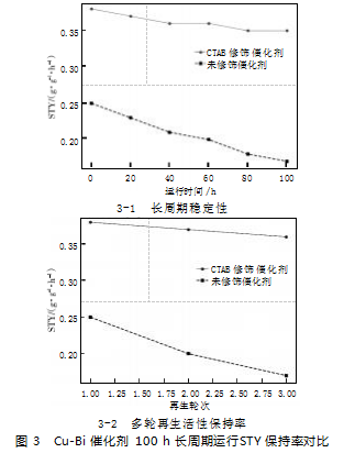 在650℃、空速2 000 h-1下进行100 h加氢测试,CTAB修饰催化剂STY由0.38 g/(g·h)降至0.35 g/(g·h),保持率为91%。未修饰样品则从0.25 g/(g·h)降至0.17 g/(g·h),保持率仅为68%,如图3所示,表明修饰组具备更优的热稳定性与抗积碳能力。