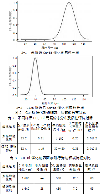 摘要:针对炔醛加氢工艺中废铜铋催化剂因积碳覆盖和传质受限导致的效率低下问题,设计了一种Cu-Bi纳米催化体系,通过介孔氧化铝载体和CTAB模板辅助界面调控,优化了催化剂的分散性与传质性能。