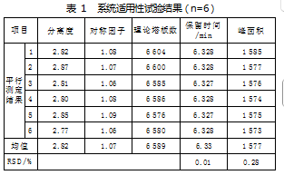 取20μL阴性对照品注入色谱柱进行测定,确认系统状态正常后,取100μL的供试品溶液,重复进样6次,如表1特征峰的分离度为2.82,保留时间6.33 min,拖尾因子1.07,理论塔板数6 588,峰面积RSD=0.28%,保留时间RSD=0.01%。