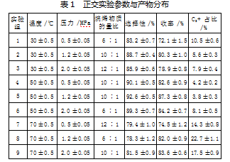 本研究采用正交实验设计方法,系统考察温度、压力与烷烯比对碳四烷基化反应性能的影响。催化剂采用HZSM-5分子筛与酸性离子液体[BMIM][HSO4]制备复合体系,具体为将焙烧后的HZSM-5加入含一定比例离子液体的乙醇溶液中搅拌2 h,经干燥处理(80℃,12 h)后获得复合催化剂,并通过XRD与NH3-TPD进行结构和酸性位点表征。反应体系由异丁烷与1-丁烯/异丁烯混合物按设定物质的量比(6∶1~12∶1)预混15 min组成,催化剂装填于高压反应釜,系统经氮气三次置换后加热升温至设定温度(30~70℃),并调控压力至目标值(0.5、1.2、2.0 MPa)以启动反应,每组实验反应时间均为2 h。实验共设计三因素三水平的9组反应组合,每组重复3次取平均值[2];反应结束后采集气相样本,使用气相色谱(Agilent 7890B)和气相色谱-质谱联用仪(Shimadzu GCMS-QP2020)分析产物组成,并借助SPSS软件进行方差分析与显著性检验,评估反应参数对异己烷选择性、收率及副产物生成的影响。