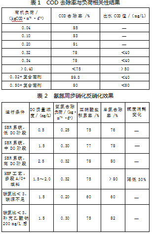 COD去除率与有机负荷呈现非线性负相关关系,如表1所示。当容积负荷从0.04 kg COD/(m3·d)提升至0.34 kg COD/(m3·d)时,系统对COD的去除率由85%降至78%。在短程脱氮工艺中,间歇曝气比(3∶1)下,COD去除负荷可达0.32 kg/(m3·d),且出水COD值稳定低于40 mg/L。高负荷条件下(>0.4 kg COD/(m3·d)),微生物代谢活性受抑制,胞外聚合物(EPS)分泌量减少15%~20%,造成吸附与降解能力下降。采用复合菌剂后,COD去除率提升至89.3%,且抗冲击负荷能力增强,即使进水COD值达5 000 mg/L,仍能维持80%以上的去除效率。数据拟合显示,COD降解符合一级反应动力学模型(R2=0.94),反应速率常数k=0.12 h-1。