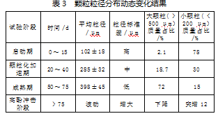 试验周期内,好氧颗粒污泥(AGS)的粒径分布呈现显著阶段性演变特征,如表3所示。启动初期(0~15 d),污泥以松散絮状结构为主,平均粒径为102μm±18μm,且粒径分布离散度较高。随着有机负荷梯度的提升(0.04→0.34 kg COD/(m3·d))与水力剪切力的调控,颗粒化进程加速。颗粒化加速期(20~40 d),粒径显著增长至285μm±32μm,大颗粒(>500μm)质量占比由2.1%提升至18.7%。成熟期(50~75 d),粒径分布趋于稳定,平均粒径达398μm±45μm,优势粒径区间为300~600μm。当进水苯酚质量浓度>450 mg/L时,粒径出现局部破碎现象(<200μm颗粒占比突增12%),推测与酚类抑制(EPS)中的β-多糖合成相关胞外聚合物。激光共聚焦显微成像(CLSM)进一步揭示,颗粒内部丝状菌的过度增殖(丰度>15%)会引发结构疏松化,造成粒径标准差增大。研究证实,通过控制曝气强度与碳源类型可优化颗粒致密性,使有效传质粒径稳定在350-450μm区间(F值为0.86,p<0.05)。